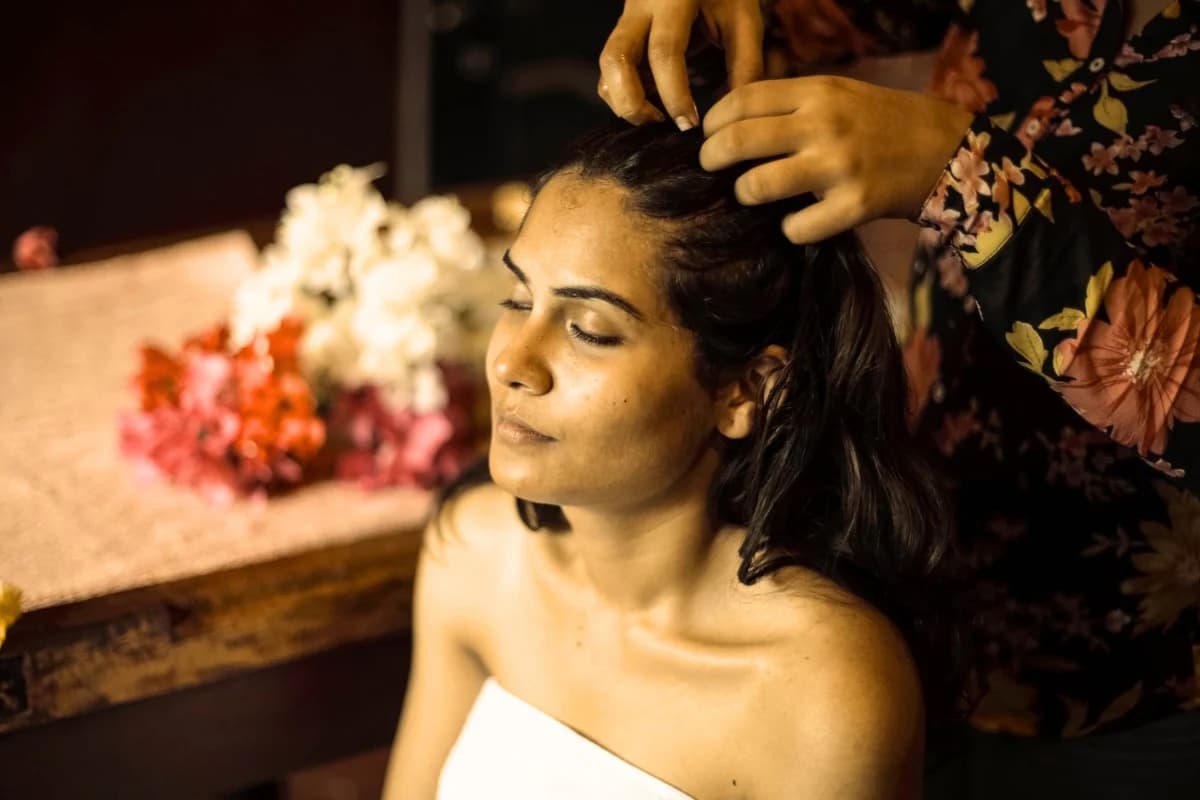 ماساژ سر (Abhyanga): ماساژ گرم با روغنهای گیاهی گردش خون را افزایش میدهد، فولیکولها را فعال میکند و استرس را کاهش میدهد.