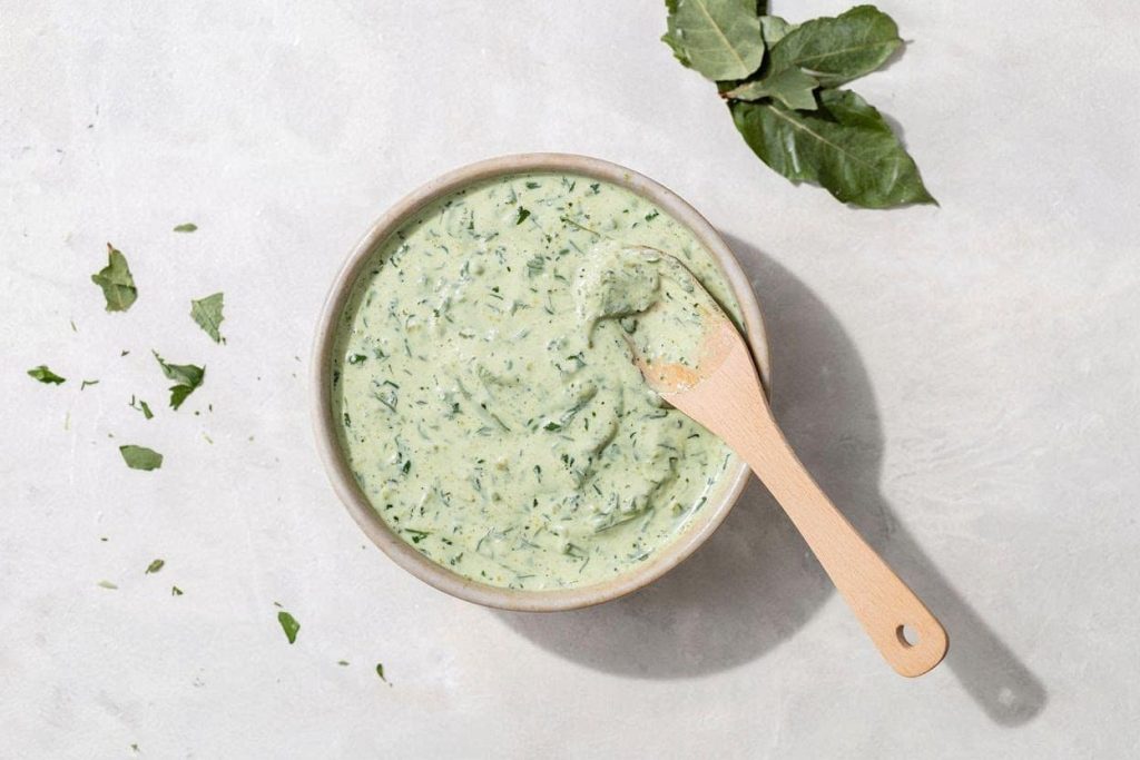 مرحله ۲: برگها را میکس کرده و با یک قاشق غذاخوری ماست ترکیب کنید.