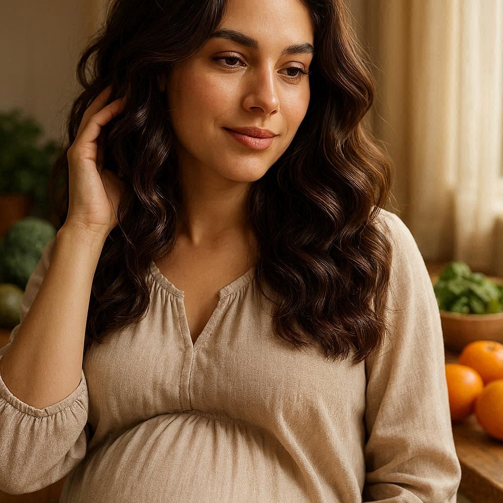 در دوران بارداری، بدن اولویت خود را به رشد جنین اختصاص میدهد و موها ممکن است از مواد مغذی کافی محروم شوند. کمبود آهن و ویتامینها میتواند منجر به تلوژن افلوویوم (ریزش مو) شود. برای پیشگیری از این مشکل، تغذیه متعادل حاوی پروتئین، آهن، روی، بیوتین و امگا-۳ ضروری است. مواد غذایی مانند اسفناج، گوشت قرمز، تخممرغ، ماهیهای چرب و آجیلها باید در رژیم غذایی گنجانده شوند. ویتامینهای بارداری (Prenatal Vitamins) که حاوی اسید فولیک، آهن، کلسیم و بیوتین هستند، هم برای سلامت جنین و هم برای تقویت موها مفیدند.